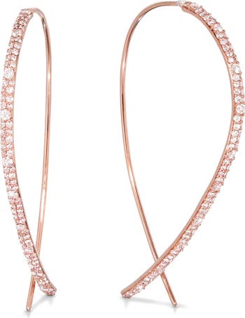 A river of sparkling diamonds cascades down the front of these streamlined hoop earrings designed with slender gold wires that delicately thread the ear.