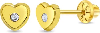 These timeless and classic clear cubic zirconia heart screw back earrings are perfect for babies to toddlers. Crafted of 14k yellow gold, a precious material that is suitable for children with sensitive skin. These round cubic zirconia heart earrings will make your sweet little girl look gorgeous all day and night. The safety screw backs make these earrings comfortable and suitable for toddlers on the move. Beautiful gift box included.