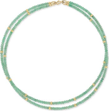 Stations of 14-karat gold interrupt the flow of 327 emerald rondelles along this double-strand necklace that adds a lovely serenity to your accessorizing options.