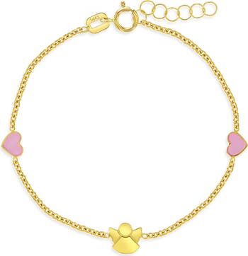 This beautiful little girl's bracelet is the a lovely accessory for those who want to keep their faith close to their heart. The centerpiece is a polished angel charm, surrounded by two pink enamel heart charms on either side. Made from 14k yellow gold, this bracelet is safe for sensitive skin and measures 5 inches with an additional 1-inch extension. The bracelet is crafted with attention to detail, making it a precious keepsake that can be treasured for years to come. Whether it's for a baptism, communion, or simply to show your love, this religious angel charm bracelet is a wonderful gift that will be cherished by any young girl. Gift box included with purchase.