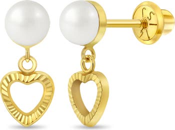 Elegant with a touch of whimsy, these little girls' earrings feature a luminous freshwater cultured pearl at the top, with a delicate heart charm gently dangling below. Crafted from genuine 14k yellow gold, they are hypoallergenic and safe for sensitive skin, ensuring comfort throughout the day. The secure screw back closures keep the earrings firmly in place, making them as practical as they are beautiful. For special occasions or as a meaningful gift, these earrings combine classic charm with youthful sweetness. A gift box is included with purchase.