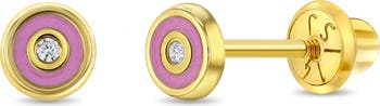 Introducing our delightful little girl's 14k yellow gold earrings, a charming addition to any young fashionista's collection! Crafted with hypoallergenic 14k yellow gold, these earrings ensure both style and safety. Adorned with a delightful pink enamel coating, they feature a tiny clear cubic zirconia stone at the center, adding a touch of sparkle and sweetness. The screw back closure provides secure wear, for active little ones. Let your little girl shine with these adorable and safe earrings, a gift for any occasion!