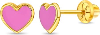 Need to give your little girl's outfit a touch of glamour? Delight her with these dazzling heart shaped earrings. Its radiant and glossy pink color gives the earrings its shimmering look like no other! Made with 14k yellow gold, these heart screw back earrings for toddlers makes them perfect for sensitive ears, and the screw on backs will assure you comfort and safety as they won't fall out. Gift box is included.