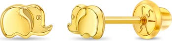 Elephants symbolize good luck, wisdom and serenity. These tiny elephant 14k yellow gold screw back earrings are adorable and charming for your pretty witty little girl. This good luck earrings for kids are a great gift idea for your little animal lovers. These beautiful earrings have kid friendly screw backs to ensure the earrings will stay safely in place all day and night. Beautifully crafted in 14k yellow gold, making it suitable for little girls with sensitive earlobes. Gift box included.