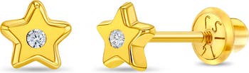 Add some sparkle and glam to your little girl's outfits with these beautiful little star earrings! Crafted entirely of 14k yellow gold, which is suitable for children with sensitive ears. These stars boast a pretty clear cubic zirconia gems on its center, and were fastened with screw backs for added comfort and safety. Order a pair of these lovely earrings today and we'll package into their own little gift box for you.