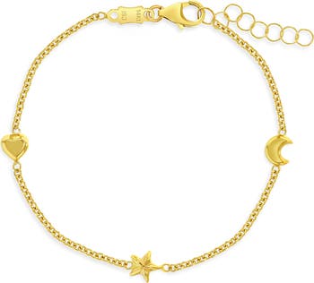 This darling little girls' bracelet is sure to become her favorite accessory. Crafted from 14k yellow gold, it's safe for sensitive skin and designed with fun shapes that are eye catching for toddler girls. Featuring polished puffed heart, moon and star charms, this bracelet adds a playful touch to any outfit. Measuring 5 inches with an additional 1-inch extension, it's adjustable to fit comfortably on her wrist. The bracelet is made with attention to detail, ensuring a high-quality accessory that's great for everyday wear or special occasions. Give the gift of charm and let your little girl shine bright with this adorable bracelet. Gift box included with purchase.