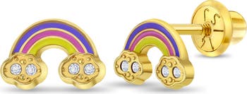 Brighten up your little one's day with these adorable rainbow enamel earrings! Designed in a charming rainbow shape, they feature vibrant enamel in soft shades of yellow, pink, and purple, bringing a playful pop of color. The shimmering clear cubic zirconia stones form delicate cloud accents, adding a touch of sparkle. Crafted from 14K yellow gold, these lightweight earrings are secured with screw-back closures for a snug and comfortable fit. A sweet gift for any child who loves rainbows and a little extra sparkle! Gift box included with purchase.