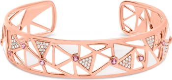 Wrapped with the opulence of 14K rose gold and studded with luminous white diamonds totaling 5/8 carats with a clarity of SI1-SI2 and G-H color, this 7-inch open cuff bangle is a masterpiece of design and distinction. The bangle dazzles with its unique pattern of elegantly open spaces and refined sections of pristine white enamel, creating a magnificent canvas that captures the eye and the imagination. Adorned with four radiant, lab-created pink tourmalines, color-treated to enhance their vivid hues, this accessory promises not only to adorn the wrist but also to captivate the beholder's heart. Each gemstone and diamond set upon this exquisite piece speaks of geometric sophistication and the promise of luxury, making it an essential treasure for those with a penchant for graceful style and timeless elegance.