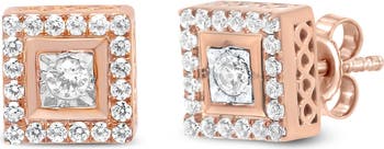 14K Rose Gold Plated Silver 1/2 Ct Diamond Halo Square-Shaped Frame Stud Earring