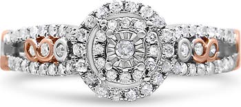 An exquisitely beautiful double frame split shank engagement ring in 14k rose gold plated .925 sterling silver, this piece is an exquisite showpiece of glamorous sparkle. Round frames of prong-set diamonds cluster the center of the ring, flanked by additional prong-set white diamonds along the shank, while the design of the ring portrays an infinity symbol for a deeper meaning to your promise to one another. The two tone color adds depth to this ring that already shines and dazzles with intricate romance that shows off total 3/8 cttw diamonds that are an approximate I-J color and I2-I3 clarity.