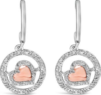 14K Rose Gold Plated Silver 1/5 Cttw Diamond Circle and Heart Drop Earrings