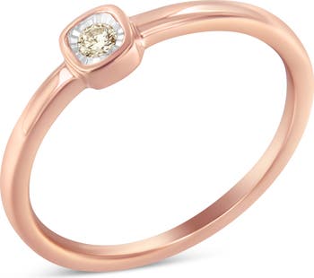 A diamond and rose gold plated ring. The ring features a central round diamond miracle set in a 14 karat gold plated setting. The diamond weighs .05 carats.