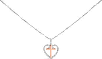 14K Rose Gold Plated Sterling Silver 1/5 Cttw Diamond Heart Cross Pendant Necklace