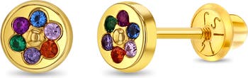 Created from hypoallergenic 14k yellow gold, these darling earrings are a delightful addition to any little girl's collection. The small round shape is adorned with a charming flower at its center, encrusted with extra tiny multicolored cubic zirconia stones for a pop of playful color and sparkle. With a secure screw back closure, they ensure worry-free wear for your precious one. These earrings aren't just accessories; they're cherished treasures for young fashionistas, providing a touch of whimsy and elegance to every outfit.