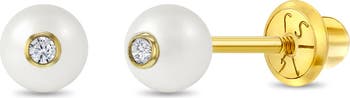 Crafted with care from hypoallergenic 14k yellow gold, these enchanting earrings are designed to dazzle. Delicate simulated pearls adorned with small clear cubic zirconia stones at their center add a touch of elegance and sparkle to any ensemble. The secure screw back closure ensures worry-free wear for your little one, allowing her to shine with confidence. These charming earrings are not just accessories; they're cherished keepsakes for any young fashionista. A small gift box is included with purchase.