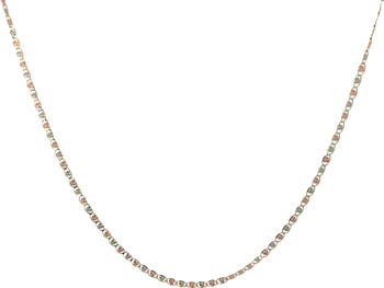 A refined take on a classic chain, this 14K tri-color gold Valentino heart-link necklace brings soft movement and subtle romance to any neckline. The 22" length sits gracefully on the collarbone, while the slim 2.6mm profile and 3.6-gram gold weight keep it light and comfortable for everyday wear. Warm yellow, white, and rose gold tones play together for a versatile piece that layers beautifully or stands on its own.