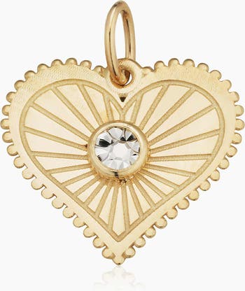 What better way to express your love than with our Heartburst Charm Pendant. A diamond cut white gold circle sits in the center of a burst of yellow gold. Radiating with a ribbed edge, it's a heart that's both modern and timeless.