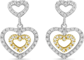 Celebrate your love by giving this alluring two-toned pair of dangle earrings to her. It features three hearts in each of the earrings, which is embellished with shimmering round-cut diamonds. Construction of this elegant pair of earrings with sterling silver and 14 karats yellow gold makes it a superb piece.