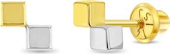 Modern and minimal, these unique little girls' earrings feature two tiny cubes, one in 14k yellow gold and the other in 14k white gold for a stylish, mixed metal look. Crafted from genuine gold and designed with sensitive skin in mind, they’re hypoallergenic and safe for everyday wear. The safety screw back closures ensure a secure and comfortable fit, for active little ones. Sleek and versatile, these geometric earrings add a subtle touch of sophistication to any outfit. A small gift box is included with purchase.
