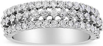 Three rows of natural, round-cut diamonds shine bright on this magnificent modern band. Created in gleaming 14k white gold, this ring showcases 1 carat of stunning diamonds in a classic prong setting. This band is the perfect accessory for any occasion. You can pair it with your everyday wear or accessorize a formal gown with it. Invest in this glamorous ring and elevate your jewelry collection.