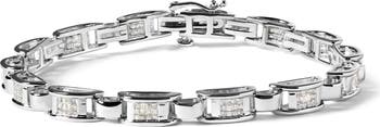 Add some glitter to your growing jewelry collection with this beautiful 14k white gold tennis bracelet. This piece is designed with gold rectangular links, each adorning 8 natural, princess-cut diamonds in an elegant channel setting. The total carat weight of this bracelet is 1.00 cttw, making it the perfect piece to pair with any formal outfit. This piece has a box clasp for a safe and secure fit.