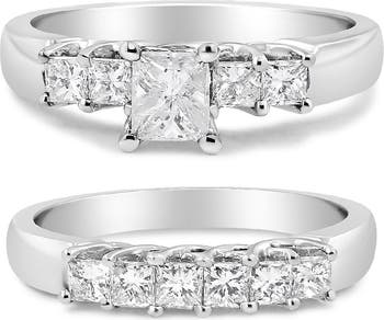 This 14k white gold diamond bridal set features a striking engagement ring and a matching wedding band. This classic five stone diamond engagement ring and matching wedding band feature a ½ ct center stone and 10 princess cut side diamonds. Each side stone is .10 ct tdw, and in sum, this wedding band set has a stunning 1 ½ ct tdw. Each princess cut is elegantly set in the sharing prong setting to minimize metal look and maximize diamond sparkle.