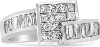 A vintage allure mixes with a modern edge in this gorgeous bypass ring crafted of genuine 14k white gold. A centerpiece of princess-cut diamonds sits within a striking invisible setting that perfectly showcases the sparkling stones and the precious metal of the ring. The shank and bypass hold their own brilliance comprised of channel-set baguette diamonds that give this ring a geometric flair that shine alongside the polished white gold. Total these diamonds are 1 1/2 cttw with an approximate G-H Color and SI2-I1 Clarity.