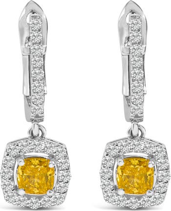 Indulge in the sustainable luxury of these radiant earrings, masterfully crafted from rhodium-plated 14K white gold. Each piece is adorned with a luscious 3/8 cttw cushion-cut yellow lab-grown diamond, cradled securely in a four-prong setting. A halo of brilliant white diamonds encircles the yellow centerpiece, their fire and sparkle harmonizing exquisitely with the warm glow. The elegance extends upward with a line of glistening white diamonds along the lever-back bail, enhancing the allure of these exquisite drop and dangle earrings. Perfect for adding a touch of glamour to everyday attire, these earrings promise both ethical elegance and timeless beauty.