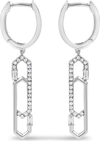 Crafted from radiant 14K white gold, these exquisite earrings celebrate sophistication with an innovative interlocking paperclip design that dangles delicately. Natural diamonds, totaling a quarter carat, glisten in neatly arranged baguette and round cuts, secured by prong settings that catch the light to reveal sparks of brilliance. These gems boast a G-H color grade and SI2-I1 clarity, ensuring a display of shimmer that captivates and enchants. Designed with a practical hinge back, they promise secure and comfortable wear. Ideal for adding a touch of modern elegance to any outfit, these earrings offer a unique blend of style and sparkle.