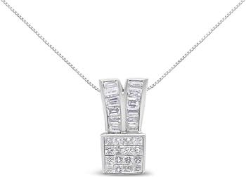 Celebrate her birthday, anniversary or your love of her every day with this gorgeous pendant. Princess cut diamonds bound by 14k white gold are crowned with channel set baguettes in a perfect double loop.