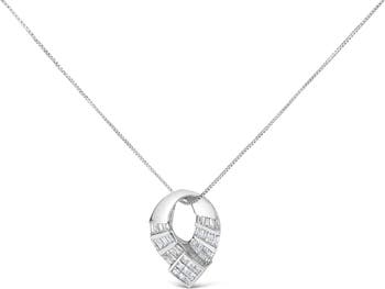 Imbued with timeless elegance, this 14k white gold pendant necklace is a symphony of precision and sparkle, where 1 5/8 Cttw of natural diamonds blend in harmony. The pendant, an angled oval of polished white gold, showcases an ingenious composition of invisible set princess cut diamonds and vertically arranged channel set baguette diamonds. Each diamond, curated for its G-H color and VS2-SI1 clarity, plays its part in a meticulously structured performance of light. The curved design and fluid diamond transition imbue this piece with an air of sophistication, making it not merely an accessory but a testament to the art of craftsmanship. Attached to an 18 inch box chain, it hangs with a confidence that complements the wearer's grace. Perfect for those who cherish elegance and the undeniable allure of carefully crafted diamond jewelry. Secures with spring ring.