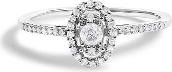 A masterpiece of delicate craftsmanship, this engagement ring is wrought from lustrous 14K white gold, finished with a rhodium plating to amplify its radiant gleam. At its heart lies an enchanting oval-shaped diamond, weighing 1/10 of a carat, cradled by a halo of meticulously set, smaller diamonds that escalate the central stone's inherent brilliance. Each diamond, natural and pure, sparkles with an H-I color grade and I1-I2 clarity, weaving a tapestry of light with every movement. The band, elegantly embellished with accent diamonds, wraps gracefully around the finger, offering a perpetual reminder of timeless elegance and boundless love. This ring, a symbol of devotion and beauty, is designed to enchant and endure, just like the love it's meant to celebrate.