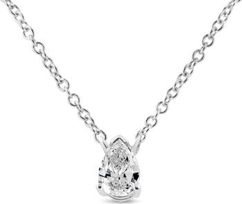 Exquisitely crafted, this solitaire diamond pendant necklace brilliantly showcases a 1/5 cttw pear-shaped diamond, nestled in a 4-prong prong. It is crafted in genuine 14k white gold, a metal that will stay tarnish free for years to come. The diamond is of an approximate G-H color and VS2-SI1 clarity. The 18" cable chain is perfect for the neckline and will draw the eye whether you wear it to the office or out on the town. With a convenient lobster claw clasp for secure wearing, this classic piece of jewelry the perfect choice when looking to add some sparkle to you look.