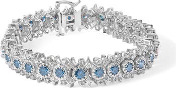 Elegance redefined, this breathtaking bracelet, adorned in 14K white gold and kissed with a rhodium finish, radiates an unmatched sparkle. Picture six carats of enchanting blue diamonds, their hues deep and evocative, masterfully set to mimic the security of bezels while maintaining the brilliance of a prong setting. They dance harmoniously around four carats of pristine, untreated white diamonds, each reflecting light in a celebratory display of clarity and color. Intricate floral clusters unfurl across this 7-inch masterpiece, showcasing vintage-inspired artistry and meticulous attention to detail. A reliable box clasp with a safety latch ensures it graces your wrist with both comfort and style, promising allure at any grand event or intimate gathering. This piece is not only an accessory but a testament to the timeless beauty of natural diamonds and sophisticated design. Blue diamonds are treated for an enhanced color.