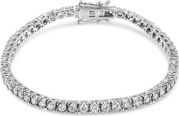 Elegant and classic, this tennis bracelet has an impressive total carat weight of 3 c.t. Crafted in sparkling 14k white gold, this bracelet is beautifully set with round-cut lab grown diamonds. The diamonds are embellished in a miracle setting, giving the stones a larger illusion. This bracelet fastens with a box clasp for a safe and secure fit. You will love how this gold and diamond bracelet sparkles on your wrist. This is the perfect accessory for any formal occasion!