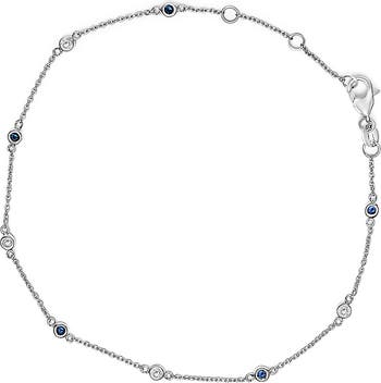 14K White Gold Blue Sapphire and White Diamond Bezel Station Chain Bracelet