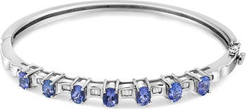 Wrap your wrist in the prettiest shade of blue. Our 14K White Gold bangle bracelet showcases 7 oval tanzanite stones measuring in at a whooping 5MM each. Diamond-accented sections highlight each lovely violet stone. The bangle has 24 natural, baguette diamonds for a total weight of 1/4 carats. Each diamond channel set and is approximately H-I in color and VS2-SI1 in clarity. A box clasp and hinge will secure this treasure to your wrist.