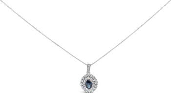 14K White Gold Oval Blue Sapphire and 3/4 Cttw Diamond Halo Pendant Necklace