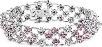 14K White Gold Pink Sapphire and Diamond Floral Lattice Link Bracelet