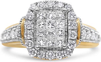 A remarkable design, this exquisite women's diamond cluster ring is a showstopper, adorned with an array of 1.00 Cttw diamonds of approximate SI1-SI2 clarity and H-I color. The eye is drawn to the center of this ring, where a collection of princess-cut diamonds form a regal empire shape in an invisible setting to perfectly showcases the sparkle of the stones. Gorgeous round, prong-set diamonds halo this centerpiece, and are also featured along the shank for added brilliance. Truly mesmerizing, this ring is fashioned in 14k white and yellow gold.