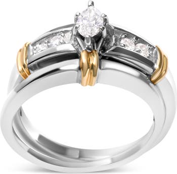 Elevate your love story with this enchanting engagement ring set, a masterpiece of design and devotion. Crafted from the harmonious embrace of 14K yellow and white gold, this set radiates a timeless allure. The centerpiece, a resplendent marquise diamond, captures the essence of eternal love. Encircled by four round-cut diamonds, it symbolizes the journey you're about to embark upon together. With a total weight of 1/3 carat, these diamonds boast an H-I color, infusing brilliance with a hint of warmth. Their SI1-SI2 clarity ensures a scintillating dance of light, a testament to your shared sparkle. The diamonds are embraced by a symphony of prong and pave settings, securing them in a graceful dance of light. This engagement ring set is more than jewelry; it's a promise, a symbol of your devotion and unity.