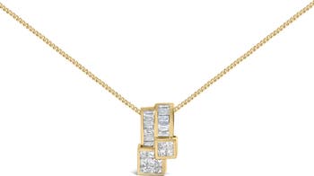Indulge in the ultimate sophistication with this exquisite geometric pendant necklace. Crafted from 14K yellow gold and adorned with a stunning combination of 11 baguette-cut diamonds and 12 princess-cut diamonds, totaling 1 1/2 cttw, this necklace is a true masterpiece. The diamonds sparkle with a radiant H-I color and VS1-VS2 clarity, expertly set in a combination of channel and invisible settings to maximize their brilliance. The pendant's unique geometric design adds a touch of modern elegance to any outfit, making it perfect for any occasion. The necklace's 18-inch box chain and secure spring ring clasp provide both comfort and peace of mind. With its timeless design and exquisite diamond details, this pendant necklace is sure to be treasured for a lifetime. Whether it's a special gift for a loved one or a well-deserved treat for oneself, this necklace is a brilliant choice for anyone seeking to add a touch of glamour to their jewelry collection.