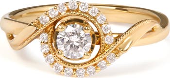 Embodying the essence of romance and eternal love, this exquisite 14K yellow gold engagement ring sparkles with a breathtaking 1/4 cttw round diamond cradled at its heart in a secure 4-prong setting, radiating a light that captures the depths of devotion. Around this central marvel, a halo of shimmering diamonds, each meticulously set in shared prongs, magnifies the radiance, while the delicate beaded milgrain detailing along the inner border whispers of antique elegance. The band itself twists elegantly, mirroring the intertwining fates of destined souls. Natural, earth-mined diamonds offer a pure and brilliant testament to a love that is as authentic as it is profound. This ring, a perfect symbol of unity and allure, is destined to become a beloved heirloom.