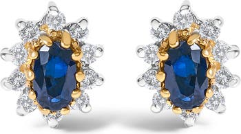 Epitomize elegance and a hint of celestial charm with these exquisite stud earrings, crafted from lustrous 14K yellow gold. At the heart of each piece lies a captivating, oval-cut blue sapphire, measuring 5x3 mm, naturally sourced and enhanced through heat treatment to reveal deep, enchanting hues. Encircling each sapphire, a sunburst halo of natural, round-cut diamonds adds an irresistible sparkle, reminiscent of the morning light scattering across the heavens. The shimmering white metal compliments are thoughtfully rhodium-plated, augmenting the brilliance and making these gems truly stand out. Securely fastened with push back closures, these earrings promise both comfort and unparalleled style, making them a luxurious addition to any outfit, a treasure that speaks of timeless elegance and sophistication.