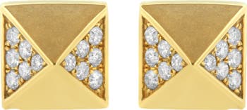 Discover the epitome of elegance with these radiant diamond pyramid stud earrings, meticulously crafted from lustrous 14K yellow gold. Each stud dazzles with a quarter carat of natural diamonds, boasting G-H color and SI1-SI2 clarity, arranged in a captivating pyramid shape that catches the light with every turn. The precision of their cut reflects not just light but the artistry behind their creation. Secured with a post and pushback closure, these earrings promise both comfort and style. Ideal for enriching everyday wear or elevating special occasions, they offer a timeless allure that makes them a perfect gift or a treasured addition to any jewelry collection.