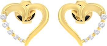 Admire your beloved with the touch of this fascinating Diamond Journey Earrings that will surely captivate her. Stunning pair of heart shaped earrings showcases 10 dazzling round cut diamonds representing your growing love. Diamonds are beautifully prong set in luminous 14 karat yellow gold. Total diamond weighs 1/8 ctw.