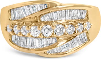 Radiating timeless elegance, this luxurious 14K Yellow Gold Ring captivates with its enchanting array of natural diamonds, amassing a full carat weight. Intertwining the classic allure of round and the contemporary charm of baguette-cut gems, it weaves a tapestry of light, reflecting off each facet in a symphony of brilliance. Crafted with a keen eye for detail, its clustered stones are securely nestled within prongs, ensuring their radiant display from every angle. This masterpiece of jewelry design, with diamonds boasting an H-I color and SI1-I1 clarity, seamlessly blends sophistication with the modern allure of a crossover pattern. The polished band, tapering smoothly around the finger, promises a comfortable embrace, making it an impeccable choice for every occasion that calls for a touch of glamour. Designed for the discerning individual, it symbolizes not just luxury, but a celebration of moments bathed in the sparkle of life.
