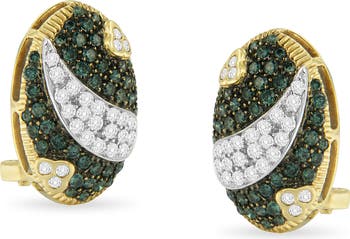 You will fall in love with these elegant four color stud earrings. A must have for any serious jewelry collection, these 14K yellow gold earrings boast an impressive 2.16 carat total weight of diamonds with a whopping 136 individual stones. The oval earrings have fluted yellow gold borders with three round, brilliant cut white diamonds on either side. The body of the earrings feature round, heat treated, pave set blue diamonds in black rhodium plated settings. The center of each earring has a paisley shape of white rhodium plated yellow gold inset with pave set white diamonds. These stud earrings feature an omega back post with clip backing in case you want to have them converted at your local jeweler’s to comfortable clip-ons for non-pierced ears. These classic, bold earrings make a great gift for any special occasion! Whether worn for daytime glamour or evening sparkle, these earrings are gorgeously versatile. Give her a gift that will perfectly complement her favorite ensemble.