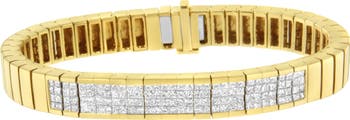 This beautiful bracelet is made in 14k yellow gold and it's inlaid with 3 5/8ct TDW of invisible set princess cut diamonds. 128 shimmering diamonds arranged in four rows inlay the top of this polished yellow gold design. A box clasp mechanism keeps the bracelet secure.