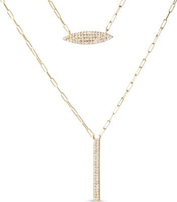 Draped in the opulence of 14K yellow gold, this exquisite necklace intertwines two distinct strands, each shimmering with nature's own sparkle, to enchant the discerning eye. The first chain gracefully carries a rectangular bar pendant, glistening with pave-set diamonds that capture light with every subtle movement. Its companion strand, shorter but equally mesmerizing, dazzles with a pave diamond-set marquise charm, crafting a delicate contrast against the sleek bar. Both elements are linked by chic paper clip links, a nod to contemporary elegance, and finished with a secure lobster claw clasp ensuring it lays perfectly upon your neckline. With diamonds of I-J color and I1-I2 clarity promising a radiant gleam, this dual-strand marvel invites not just admiration but a profound sense of personal luxury. Perfect for those who cherish modern sophistication threaded with timeless craftsmanship. The larger chain is 20 inches in length and the smaller chain is 18 inches in length.